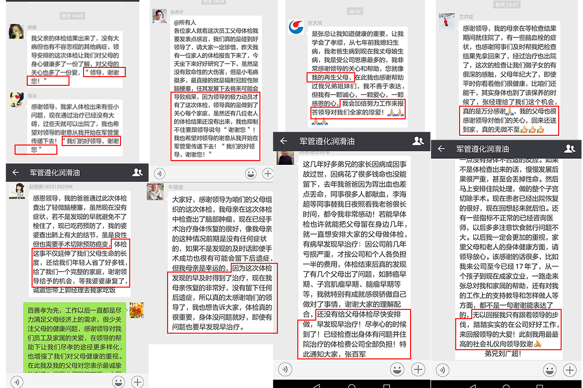 自從2018年相關數據顯示公司已經扭轉連續多年虧損的狀態,總經理張百軍首先想到的是——公司員工的健康問題,于2018年3月組織全體員工體檢,對于體檢張百軍總經理要求不能敷衍了事,要針對全體員工的情況,制定相應的體檢項目,幾經周折最終選定在唐山人民醫院體檢中心做體檢工作。沒有想到員工的健康問題只是張總關心的問題之一,隨后張總召開中層領導會議提出給員工父母體檢的想法,隨著時間的流逝,父母的年齡在不斷的增長,身體狀況也是每況愈下,但是他們對自我身體的健康意識卻非常的薄弱。于是接下來開始動員全體員工勸說父母參加公司組織的體檢活動,又指定專人去各個醫院了解針對老年人的體檢項目,全體員工各司其職進行著前期的籌備工作,于2018年8月完成了公司所有員工父母的體檢工作,所有員工父母對張總此次給予大家的福利深感謝意。其中多名員工的父母在這次體檢中受益匪淺,及時將病情扼殺在搖籃之中,為此多名員工表達了對張總的感謝。